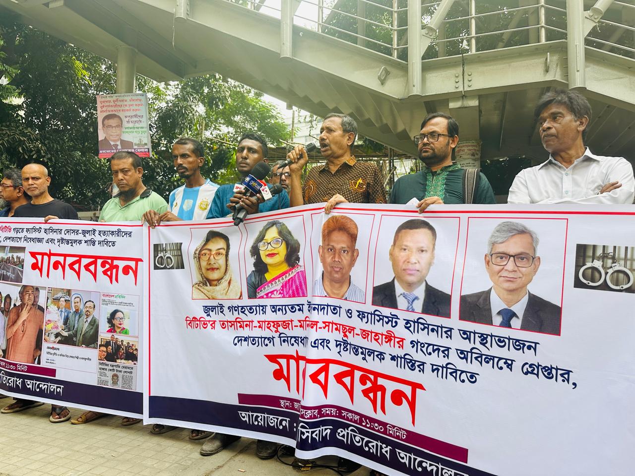 মানববন্ধনে সংগঠনের সভাপতি মোহাম্মদ অলিদ বিন সিদ্দিক তালুকদার বলেন, বাংলাদেশ টেলিভিশনের ‘জুলাই গণহত্যায় বিটিভির কুশীলব’-দের একজনকেও গ্রেপ্তার, বরখাস্ত, দেশত্যাগে নিষেধাজ্ঞা, বাধ্যতামূলক অবসর কিংবা সামান্যতম বিচারের মুখোমুখি করা হয়নি। বরং জুলাই গণহত্যায় প্রমাণিত বিটিভির অন্যতম কুশীলব উপমহাপরিচালক (বার্তা ও অনুষ্ঠান) ড. সৈয়দা তাসমিনা আহমেদ, তৎকালীন জেনারেল ম্যানেজার (চলতি দায়িত্ব) মাহফুজা আক্তার, ছাত্র আন্দোলনের বিরুদ্ধে অর্থ যোগানদাতা সিনিয়র ইঞ্জিনিয়ার (চলতি দায়িত্ব) ছাত্রলীগ নেতা মো: মনিরুল ইসলাম এবং আন্দোলনকারীদের বিরুদ্ধে গঠিত প্রচার-প্রচারণা কমিটির প্রধান-নির্বাহী প্রযোজক (বার্তা) শামছুল আলমদের সুপরিকল্পিতভাবে গুরুত্বপূর্ণ পদে রেখে পূর্বের মত ফ্যাসিবাদী রাজত্ব কায়েমের মাধ্যমে দুর্নীতি, লুটপাট এবং তথ্য পাচারের ব্যবস্থা করা হয়েছে।